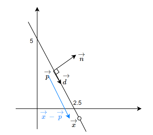 $\overrightarrow x - \overrightarrow p$는 방향벡터 $\overrightarrow d$ 에 평행하고 $\overrightarrow d$ 의 스칼라배 형태여야 한다. 즉, 적당한 스칼라 t에 대해 $\overrightarrow x - \overrightarrow p = t \hat d$ 또는 $\overrightarrow x = \overrightarrow p + t \hat d$ 이어야 한다.