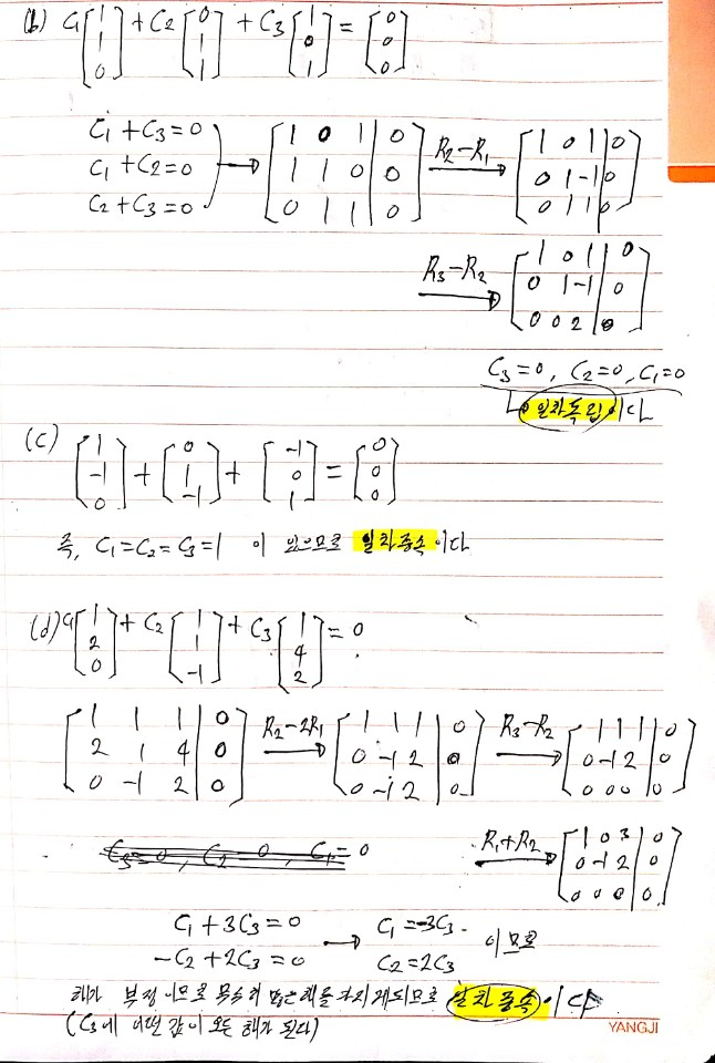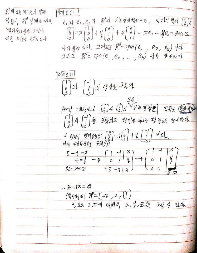 일차 독립(linear independent)) : 일차 결합으로 다른 벡터를 표현 할 수 없는 벡터집합
