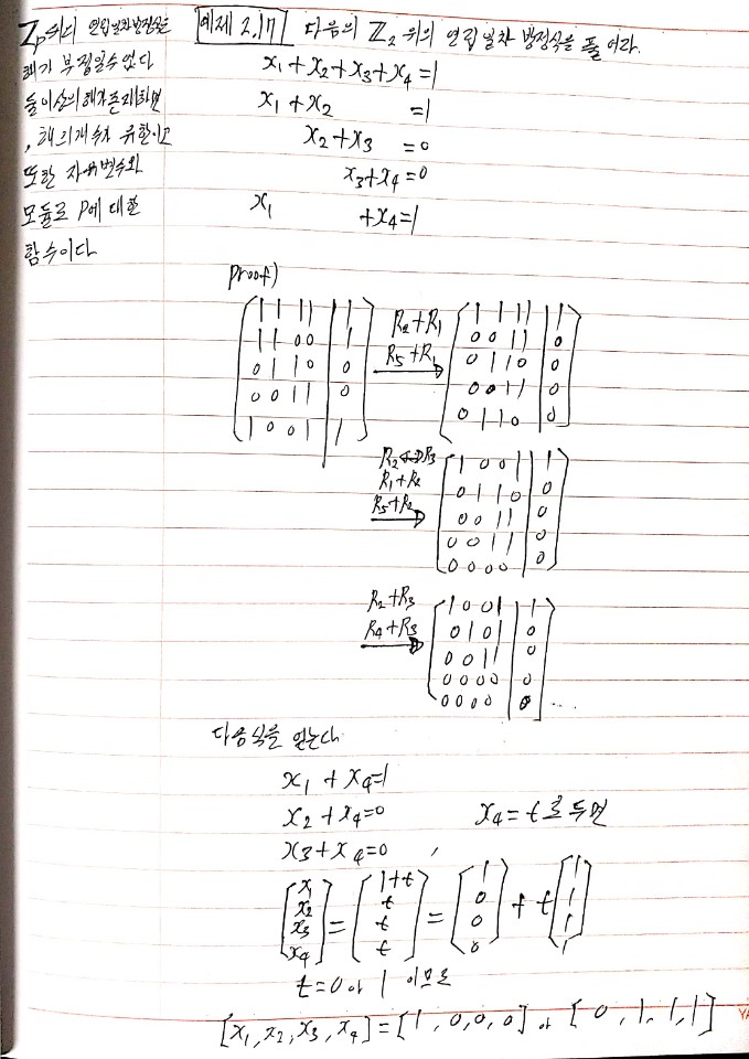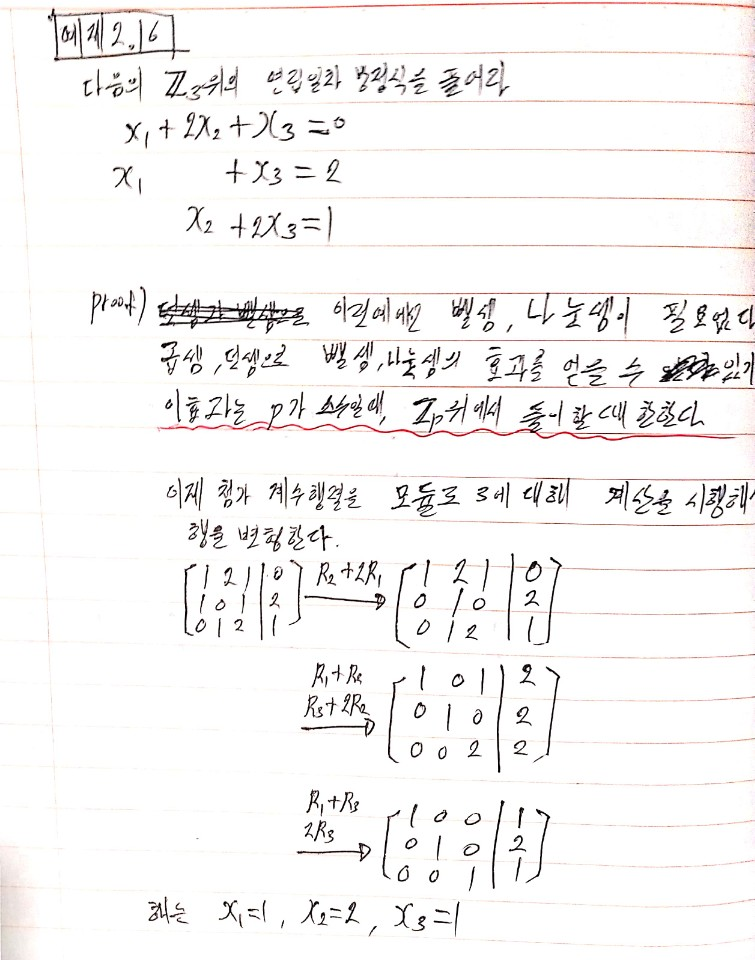 그러므로 미지수와 계수가 $\mathbb Z_p$인 수 일때의 연립 일차 방정식을 풀 수 있다.