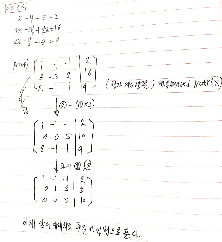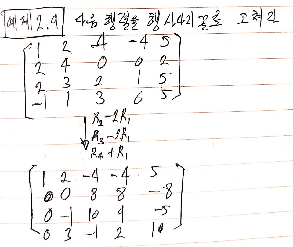 2. 첨가 계수행렬을 행사다리꼴로 바꾸기 위하여 기본 행변환을 시행한다.