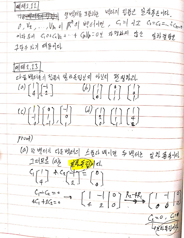 $0V_1+0V_2+\cdots+0V_n=0$ 이므로 일차종속은 필수적으로 영벡터를 $V_1 ~ V_k$의 자명하지 않는 일차결합으로 표현할 수 있다. 즉, 일차독립은 영벡터를 $V_1~V_k$의 일차결합으로 나타내는 방법이 모든 계수 $C$가 $0$인 자명한 경우 뿐임을 의미한다. |