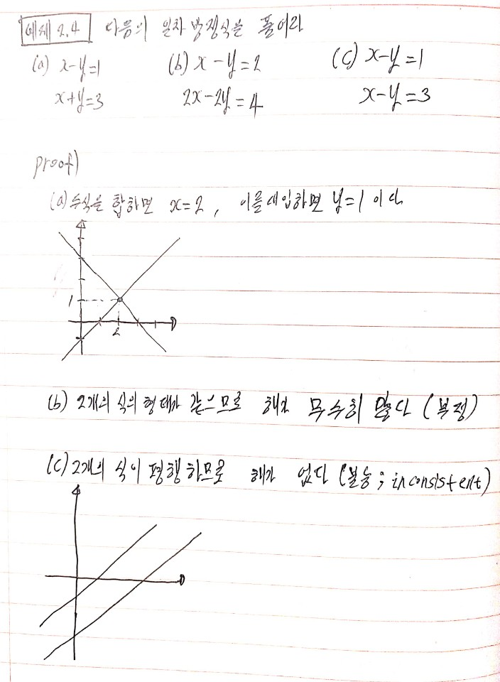 위와 같은 연립일차방정식이 주어질때 해는 $x=2, y=1$이다.