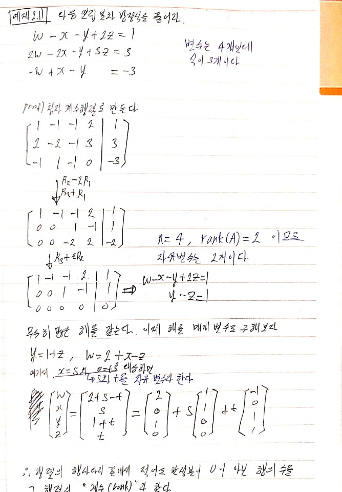 \left.\begin{matrix}1\\1\\0\end{matrix}\right]$ 이 된다. 행렬의 계수는 $rank(A)=2$ 이고 미지수의 갯수는 $4$개이므로 $4-2=2$으로 자유변수의 갯수는 $2$ 이다.