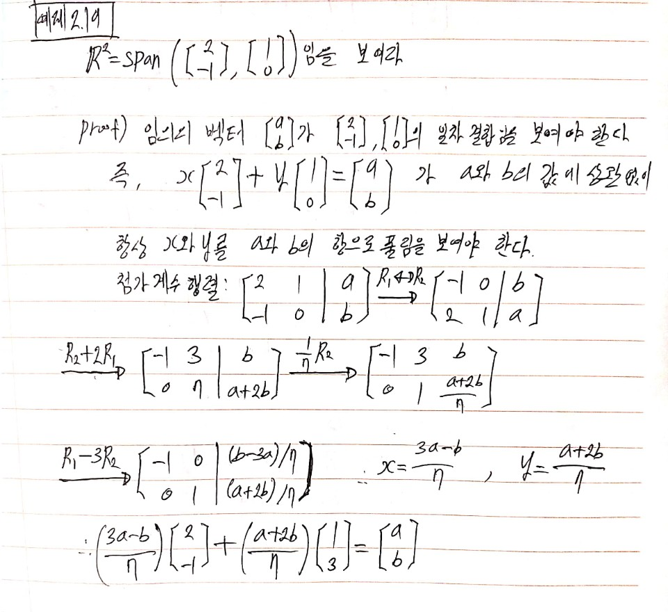 $$\left[\begin{matrix}2&3&-1\\-1&5&2 \end{matrix} \right| 첨가 계수 행렬을 확인하면 어떤 행 연산을 하더라도 상수항은 항상 0 이 되므로 0이 유일한 해임을 알 수 있다. |