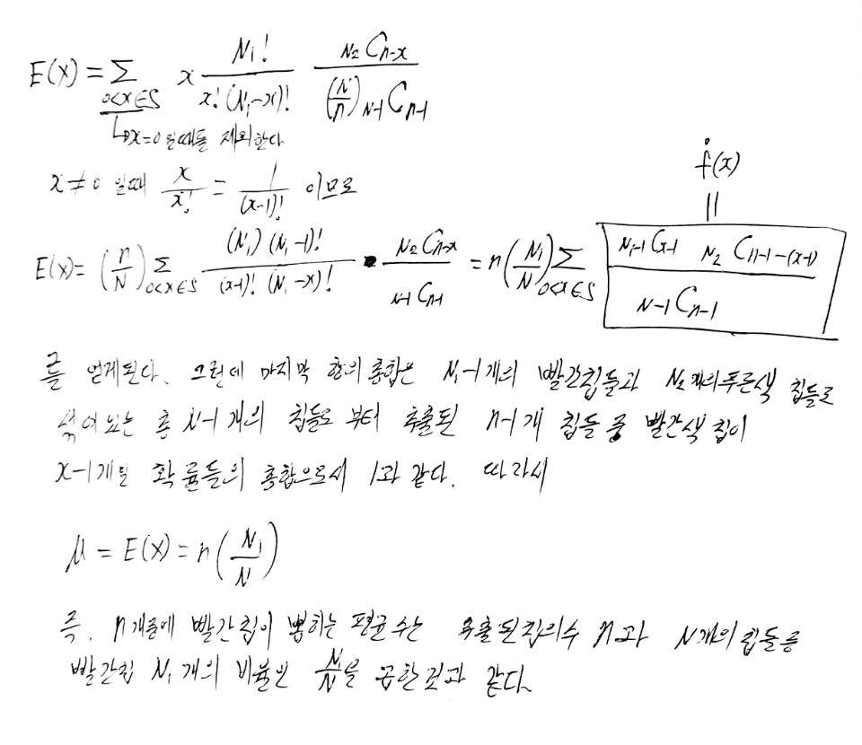 이때 확률변수 $X$는 $N_1$중에서 뽑는 갯수를 말하며 이를 초기하분포라 한다.