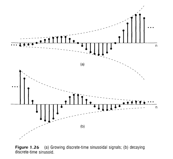 $|\alpha|<1$일때 정현파 신호가 지수적으로 감쇠하며 $|\alpha|>1$일때 신호는 지수적으로 증가함을 볼 수 있다.
