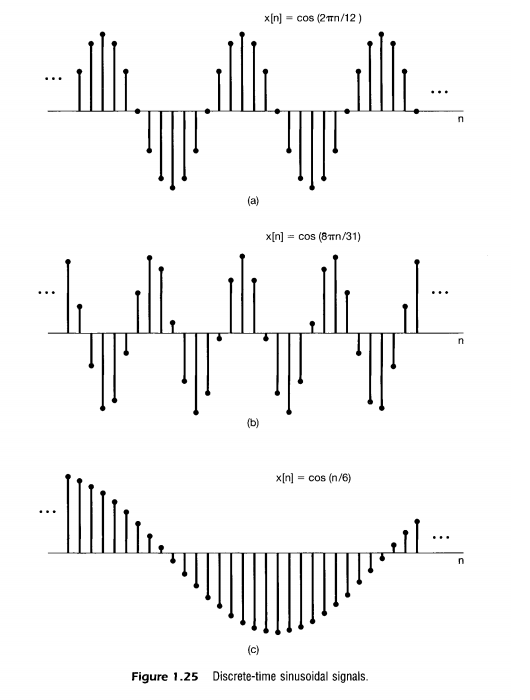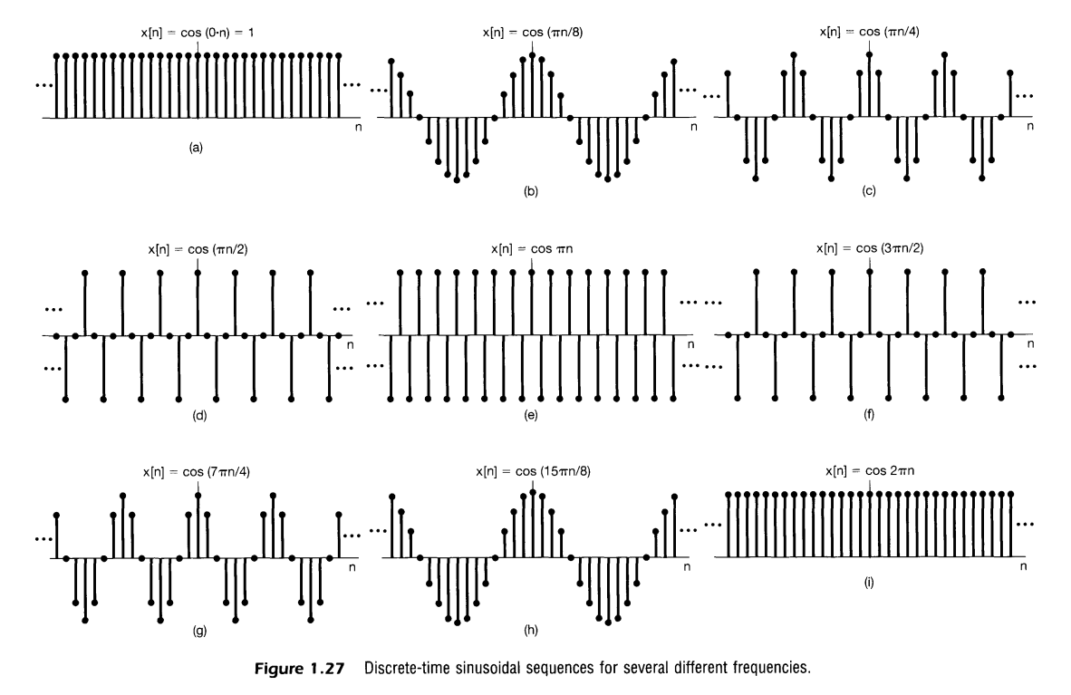 그리고 $e^{j(w_0+2\pi)n}=e^{jw_0n}e^{j2\pi n}, (n \in \mathbb Z)$ 식에서 보이는것 처럼 신호 $e^{jw_0n}$의 $w_0$의 크기가 증가할수록 진동이 계속해서 증가하지는 않는다.