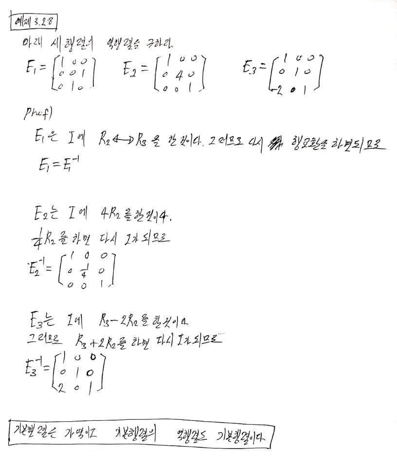 기본행렬은 단위행령에 한번의 기본 행 변환을 적용하여 얻을수 있느 ㄴ행렬이다.
