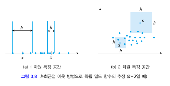 $\circ$ k-최근접 이웃법은 $\mathscr x$를 중심으로 샘플이 k개 들어올때 까지 창의 크기를 확장해나간다. $k$개가 들어온순간 창의 크기를 $h$라 한다.