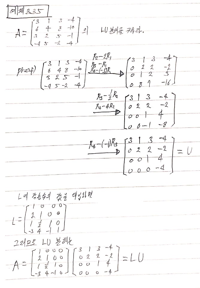 $\bullet$ 개념서에 따라서는 $LU$분해에서 $L$이 하삼각행렬이고 $U$는 상삼각행렬인 임의의 분해 $A=LU$로 정의하기도 한다.