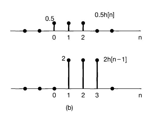 신호 $\delta[n+1],\delta[n],\delta[n-1]$에 대한 응답 $h_{-1}[n],h_{0}[n],h_{1}[n]$이 [그림 2.2 (b)]에 표시되어 있다.
