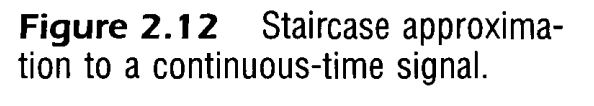 위 특성을 연속시간에 대응시키기 위해 [그림 2.12 (a)]에 나타난것 처럼 연속시간 신호 $x(t)$를 펄스 또는 계단식 근사 $\hat x(t)$ 라고 간주하고 시작해보자.