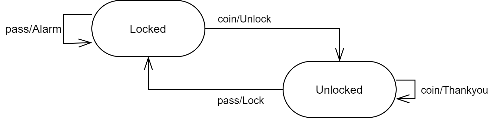 위 그림은 지하철 회전식 개찰구에 대한 state machine을 보여준다. 여기에는 $Locked$와 $Unlocked$라는 이름을 가진 2개의 상태가 주어진다. 2개의 $events$는 아마도 machine에게 보내질것이다. $coin$ 이벤트는 사용자가 회전식 개찰구에 동전을 넣었음을 의미한다. $pass$이벤트는 사용자가 회전식 개찰구를 통과함을 의미한다.