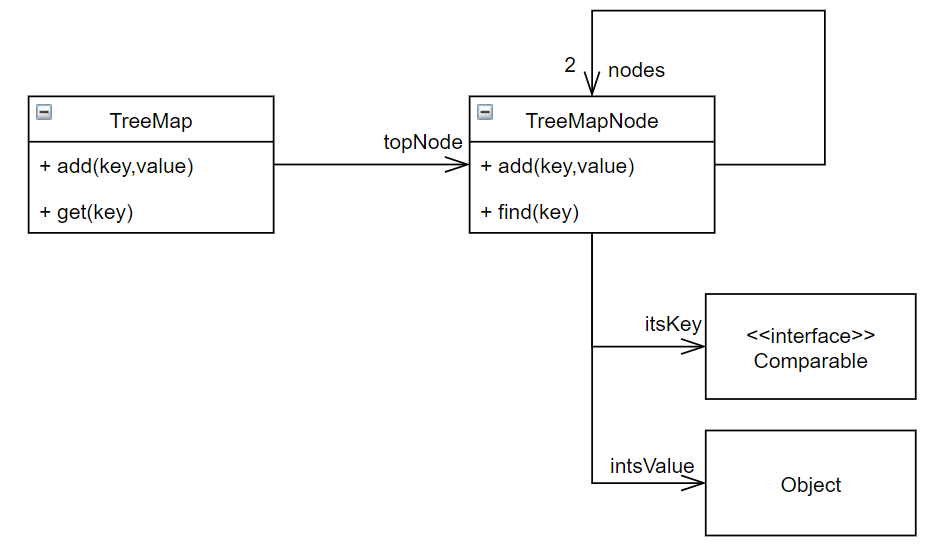 가령 $TreeMap$에서 $TreeMapNode$로의 관계는 $topNode$라는 이름으로 이루어져있다. 코드를 보면 $TreeMap$클래스에 $topNode$변수가 있음과 일치함을 알 수 있다.