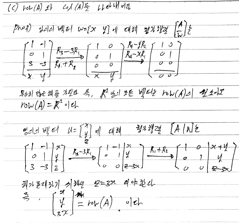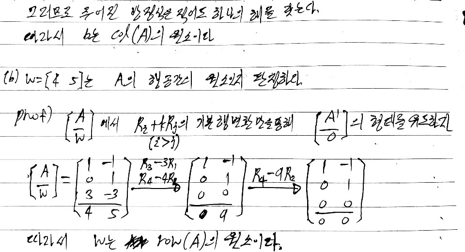 가령 $w$가 $row(A)$의 원소이기 위한 필요충분조건은 $w^T$가 $col(A^T)$의 원소인것이다.
