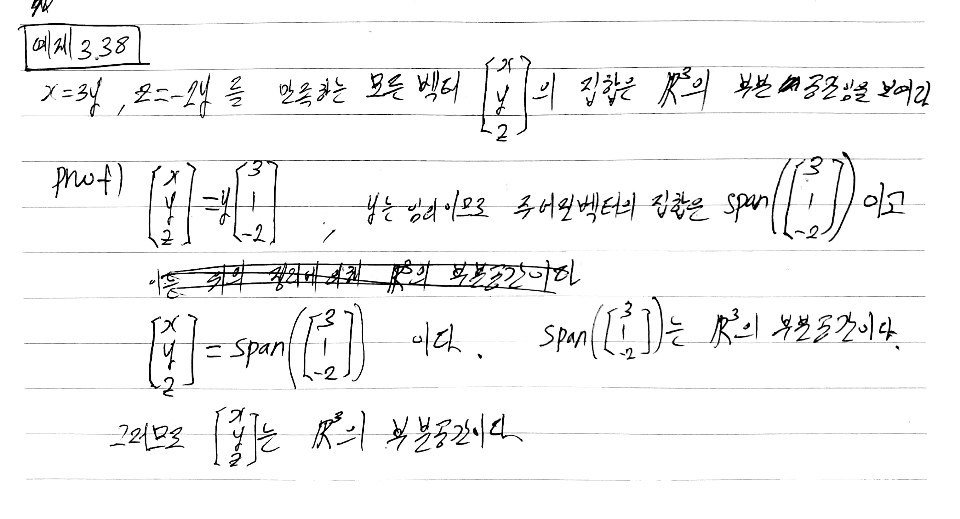 즉, 부분공간은 $\mathbb R^3$에서 원점을 지나는 평면, $\mathbb R^n$에서 원점을 지나는 초평면이라는 직관적인 사고로 바라 볼 수 있다.