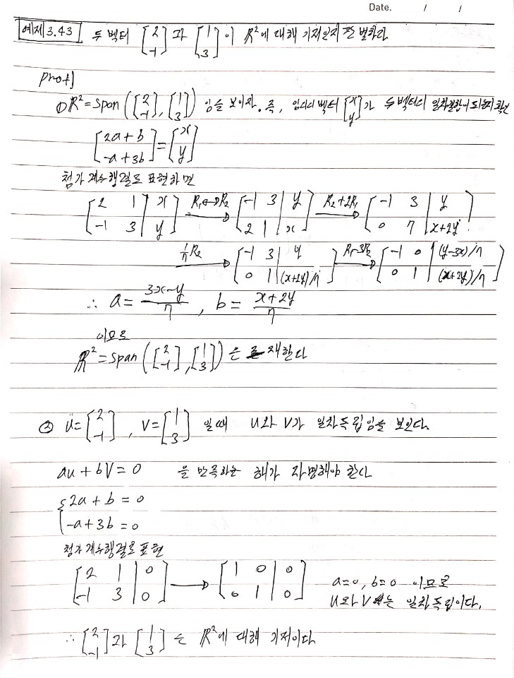 $\bullet$ 두 벡터보다 더 적은 개수로는 그런 역할을 할 수 없고 더 많이 필요하지도 않다. 이것이 부분공간에 대한 기저의 이론이다.
