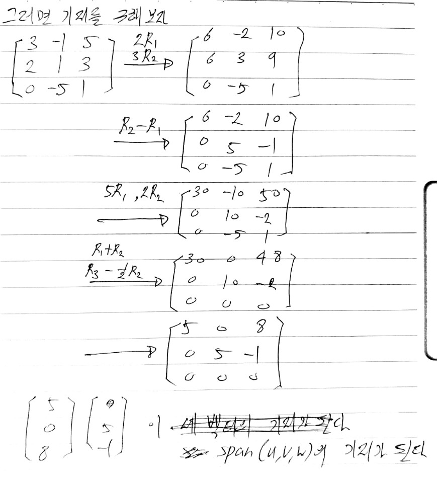 영공간에 대한 기저가 아닌 열공간이나 행공간에 대한 기저를 구하는거라면 기약 행 사다리꼴이 아닌 평범한 행 사다리꼴로 변형시켜도 된다.