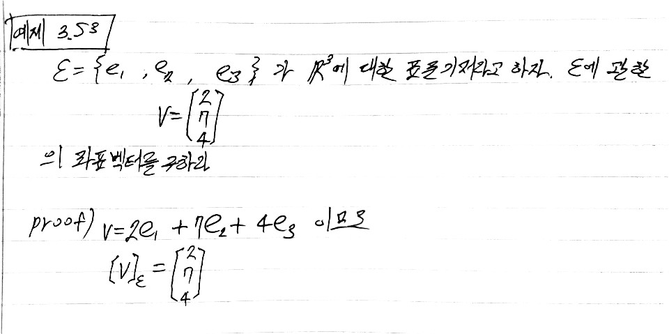 따라서 $\mathcal B$에 속하는 벡터 $v$를 기저벡터의 일차결합으로 표현하는 방법은 유일하다.