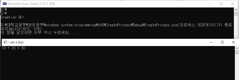 CreateProcess.cpp 의 실행결과는 아래와 같다.