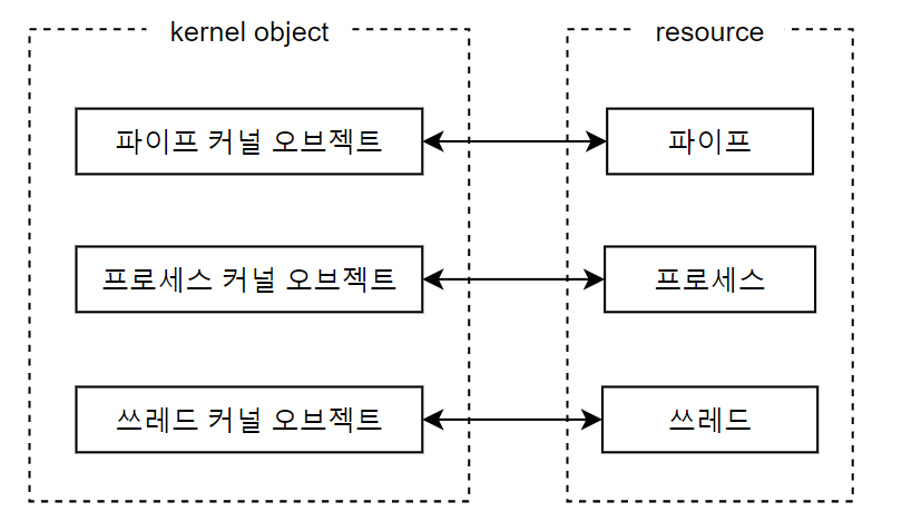 $\therefore$ kernel object란 windows OS가 프로세스, 스레드, 파일과 같은 리소스를 원활히 관리하기 위해 필요한 정보를 저장할 메모리 블록을 지칭하는 말이다.