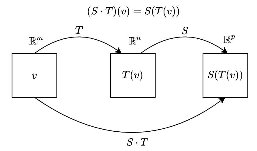 $T : \mathbb R^m \rightarrow \mathbb R^n$과 $S : \mathbb R^n \rightarrow \mathbb R^p$ 가 선형변환이면, $S \cdot T : \mathbb R^m \rightarrow \mathbb R^p$도 션형변화니다. 더욱이 이들의 표준행렬은