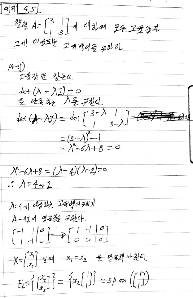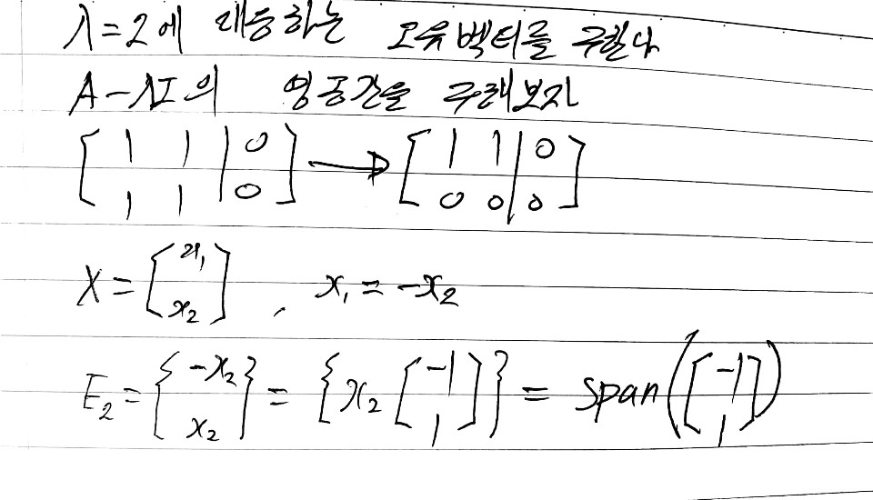 그리고 영벡터와 함게 $\lambda$에 대응하는 모든 고유벡터의 집합을 $\lambda$의 고유공간(eigenspace)라 하고 $E_\lambda$로 적는다.