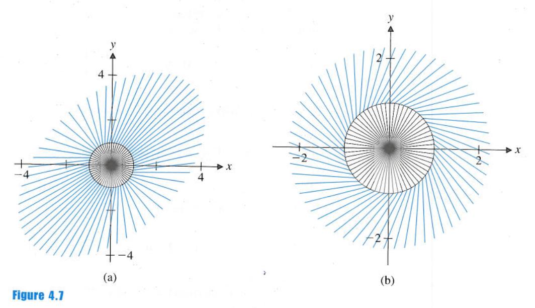 그림 4.7(a)는 예제 4.1의 행렬 $A = \begin{bmatrix} 3 & 1 \\ 1 & 3 \end{bmatrix}$ 로 변환했을때를 보여준다.
