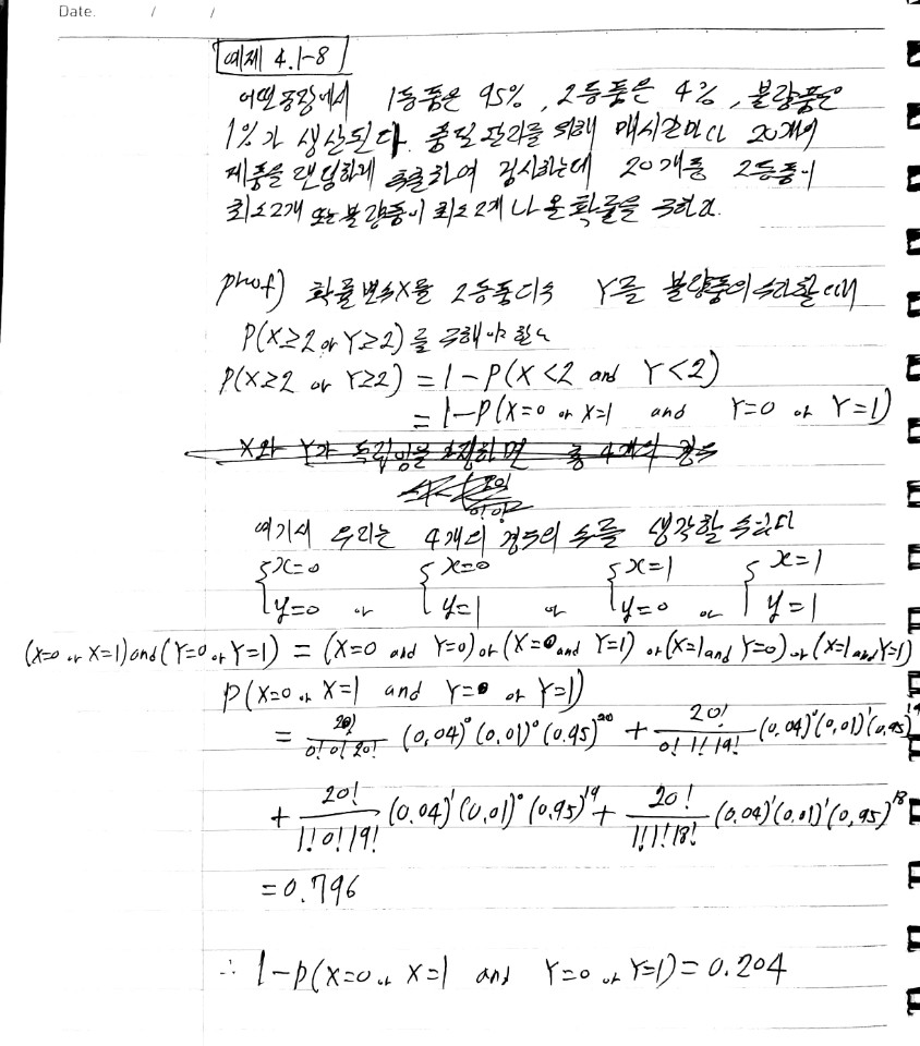 우리는 확률변수가 2개인 경우의 분포에서는 공간 $S$가 직사강형을 이루고, 결합함수가 각 확률변수들의 곱으로 되어있으면 독립임을 알 수 있다. 이는 확률변수가 다수로 이루어젔을때에 대해서도 일반화 가능하다. 대표적으로 2개의 주사위를 던지는 경우와 예제 4.1-4의 경우에 공간 $S$는 삼각형을 이루므로 종속이 되고 예제 4.1-3의 공간 $S$가 직사강형이고 결합함수가 확률변수의 곱으로 되어있으며 독립임에 주목하라