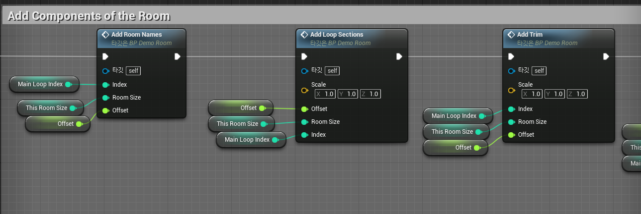 이 값에 몇번째 방인지를 나타내는 ThisRoomSize을 곱하고 각 방사이의 연결부위의 길이인 TrimWidth를 더해주면 현재 방 내에서 다음 구역의 패널이 올 위치를 알아낼 수 있다. 이 위치를 ThisOffset 변수에 저장한다.