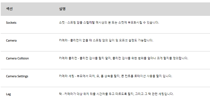 https://docs.unrealengine.com/ko/Gameplay/HowTo/UsingCameras/SpringArmComponents/index.html