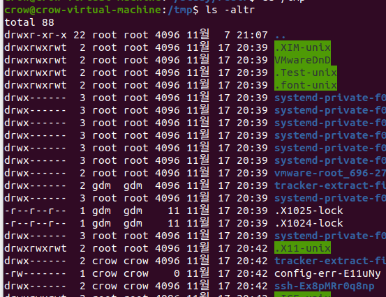 - 숨겨진 파일들을 상세정보와 함께, 수정시간을 기준으로 오름차순으로 정렬한 결과를 출력한다.