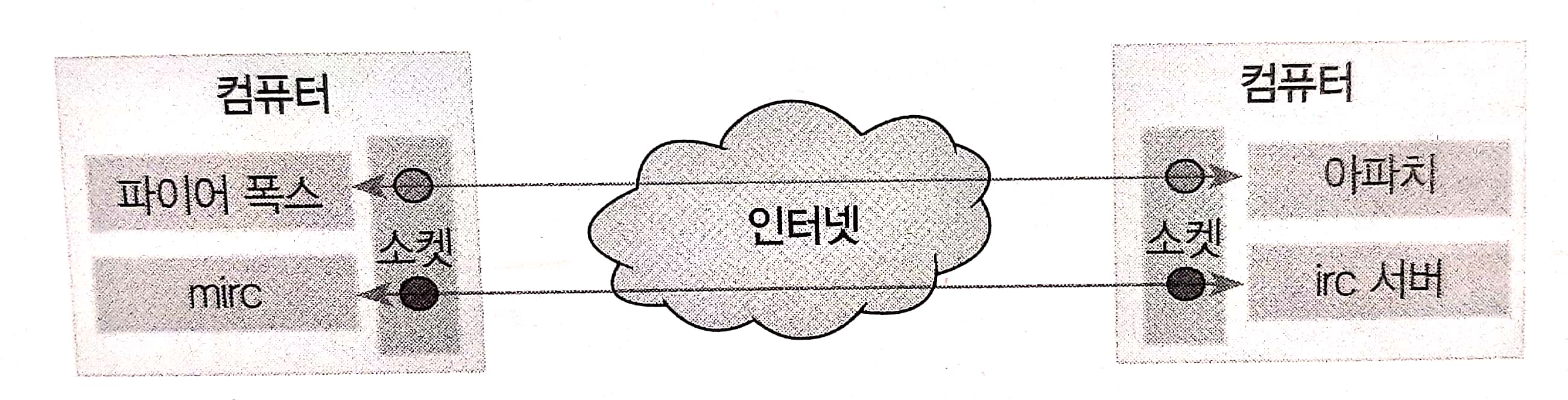 - 가령 웹서비스를 위해서는 서비스를 제공하는 '웹서버 프로그램'(아파치, IIS)과 서비스를 요청하는 '웹 클라이언트 프로그램'(파이어 폭스, 사파리, IE)이 필요하다.