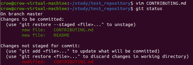 - CONTRIBUTING.md 라는 파일을 수정하고 git status 명령으로 상태를 확인한다.