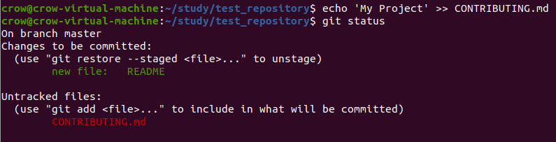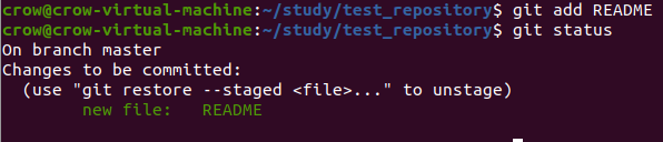 - 프로젝트에 README 파일을 새로 만들고 git status를 실행하면 Untracked files에 들어있음을 확인 가능하다.