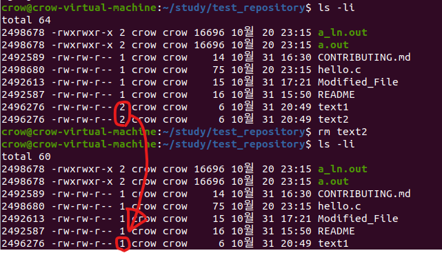 - 원본 파일이나 하드링크로 새로 만든 파일을 삭제하면 하드 링크의 개수가 줄어듬을 확인 할 수 있다.