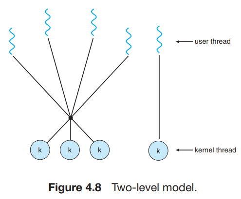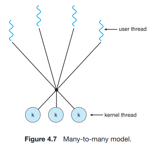 - 여러개의 사용자 수준 스레드를 그보다 작은 수 혹은 같은수의 커널 스레드로 멀티플렉스 한다.