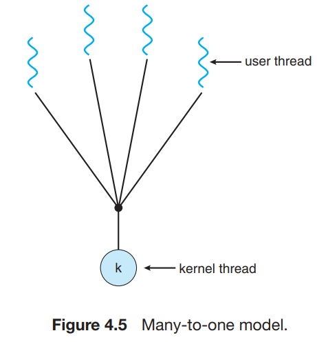 - 한 스레드가 봉쇄형 시스템 호출을 할 경우, 전체 프로세스가 봉쇄된다.