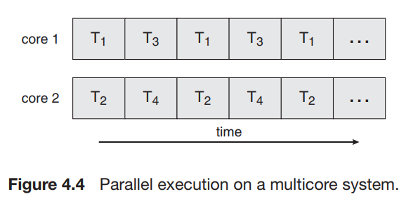 - 각각의 스레드가 다른 처리기에서 병렬로 수행될 수 있다.