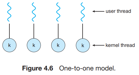 - 각 사용자 스레드를 각각 하나의 커널 스레드로 사상한다.