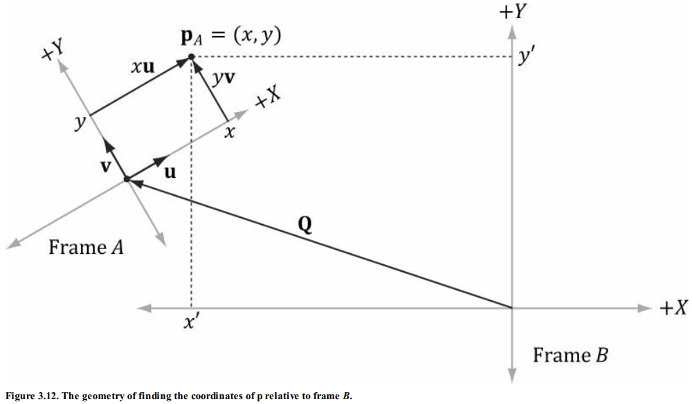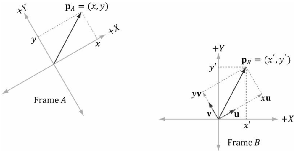 따라서, $\mathbb p_A = (x,y)$가 주어졌을 때 만일 좌표계 $B$에 상대적인 벡터 $u$와 $v$, 원점 $Q$의 좌표들을 안다면, 다시말해 $\mathbb u_B = (u_x, u_y), \mathbb v_B = (v_x, v_y), \mathbb Q_b(Q_x, Q_y)$를 알면, 항상 $\mathbb p_B = (x', y')$을 구할 수 있다.