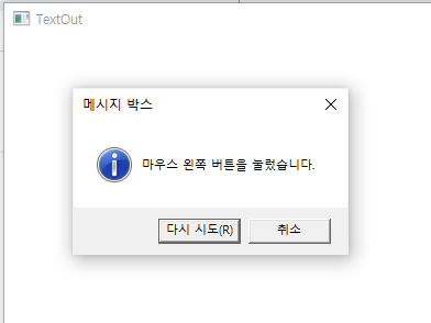 TEXT("메시지 박스"), MB_ICONINFORMATION | MB_RETRYCANCEL);