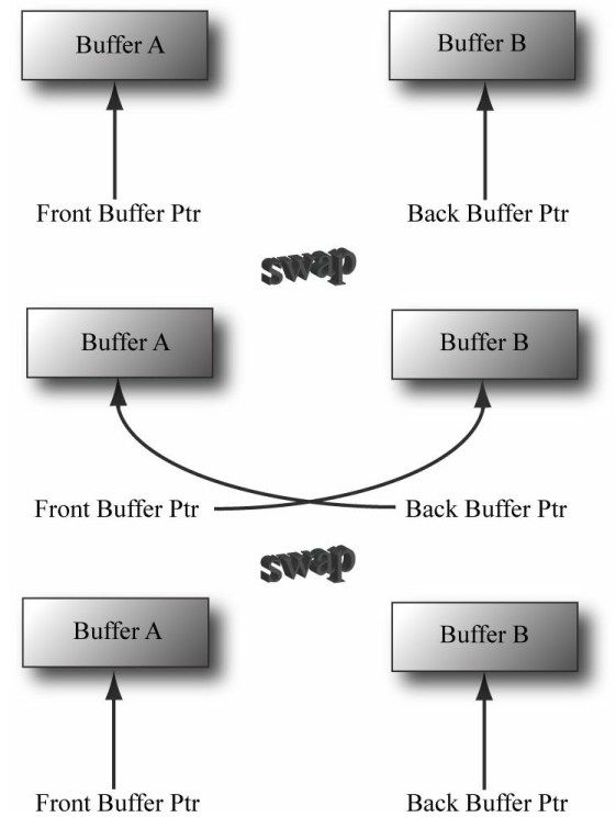 이러한 현상을 피하고자 사용하는 방법이 2개의 프레임 버퍼를 이용하는것이다. 각각의 프레임 버퍼는 각 화면 바깥의 텍스처인 후면 버퍼(Back Buffer)와 전면 버퍼(Front Buffer)을 뜻한다. 전면버퍼를 이용해 현재 화면을 표현하면서, 다음 화면이 될 장면을 후면 버퍼에 미리 저장해놓은후 다음프레임으로 넘어가야 할 경우에 버퍼만 교환한다면 사용자는 깔끔한 화면을 볼 수 있게 된다. 이러한 기법을 더블 버퍼링(Double Buffering)이라고 부른다.
