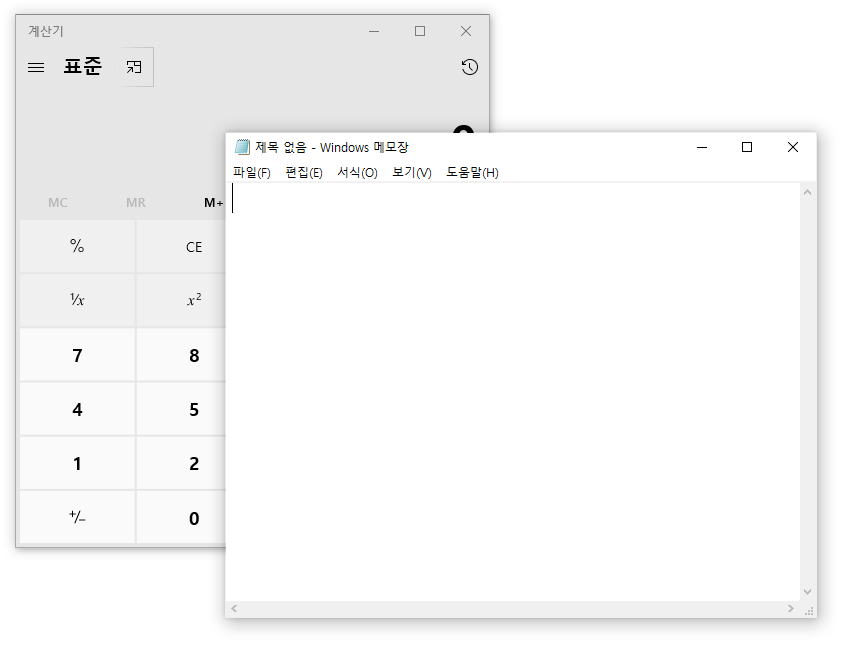 이 상태에서 메모장이 자리를 옮겨 계산기의 가려젔던 부분이 드러나면 이 부분이 무표영역이 된다.