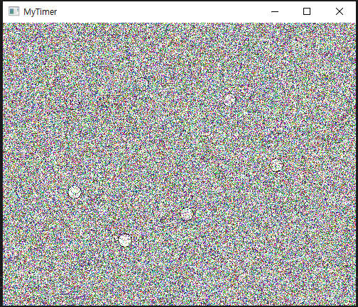 초당 20번 주기의 타이머를 설치하고, 주기마다 1000개의 점을 난수로 얻은 임의 좌표에 임의 색상으로 출력하고, 좌클릭 하는 지점에는 하얀 원이 그려지게끔 하는 윈도우이다.