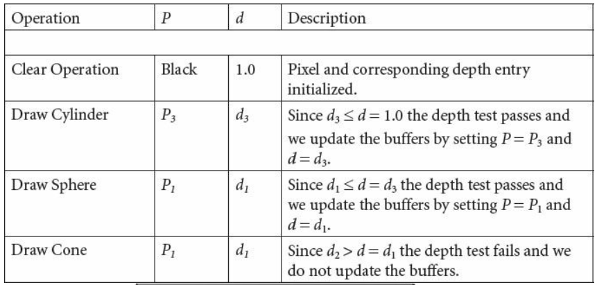 물체를 읽게되는 순서가 $P_3 \rightarrow P_1 \rightarrow P_2$ 라 가정하자. 물체를 읽을때마다 그 거리를 깊이버퍼에 갱신하는데, 물체까지의 거리가 깊이버퍼 값 보다 짧다면 깊이버퍼를 갱신하고, 후면버퍼에는 해당 물체를 새긴다. 하지만 물체까지의 거리가 깊이버퍼의 값 보다 멀다면 해당 물체는 무시하고 넘긴다.