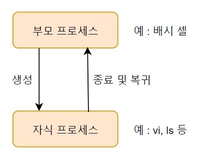 - ex) 사용자가 vi를 실행하면 셸이 vi 프로세스를 생성할 경우, 셸은 부모 프로세스가 되고 vi는 자식 프로세스가 된다. 사용자가 vi를 종료하면 다시 부모 프로세스인 셸로 돌아간다.