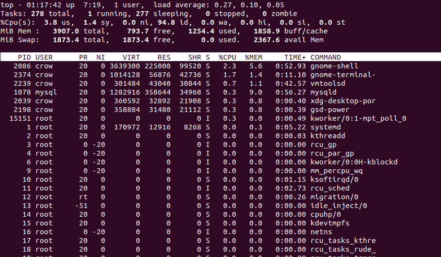 | VIRT | 프로세스가 사용하는 가상 메모리의 크기 | COMMAND | 명령 이름 |