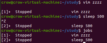vim과 sleep 명령을 포그라운드 작업으로 실행한 후, Ctrl + z 명령으로 일시 정지 시킨 모습이다.