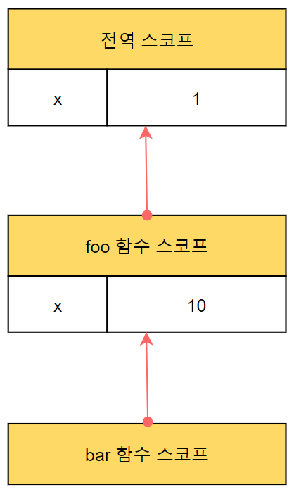 그러므로 bar 함수 스코프가 참조하는 변수 x의 값은 10이 된다.